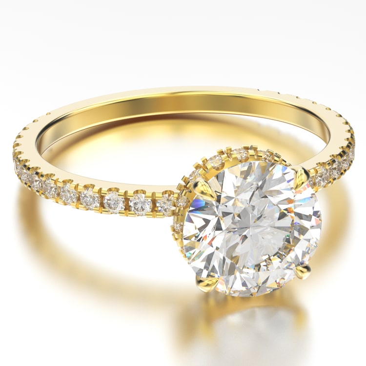 טבעת יהלום קלאסית בעלת מראה מיוחד, עשויה מזהב צהוב ומשובצת ביהלום במשקל 70 נקודות (0.70 קראט) וב30 יהלומים על חישוק הטבעת במשקל כולל של 150 נקודות (1.5 קראט).