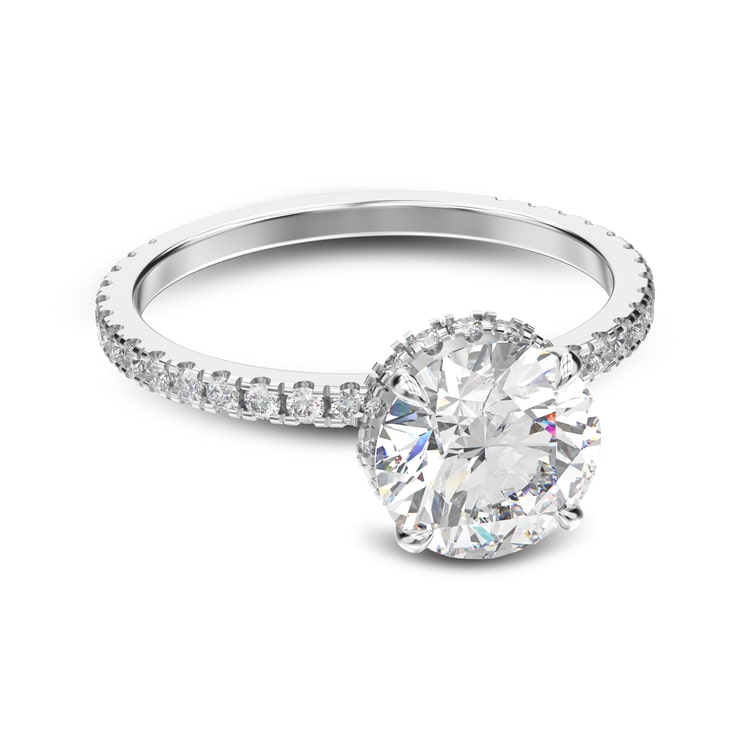 טבעת אירוסין בעלת מראה עדין, עשויה מזהב לבן ומשובצת ביהלום במשקל 45 נקודות (0.45 קראט) וב20 יהלומים על חישוק הטבעת במשקל כולל של 40 נקודות (0.40 קראט).